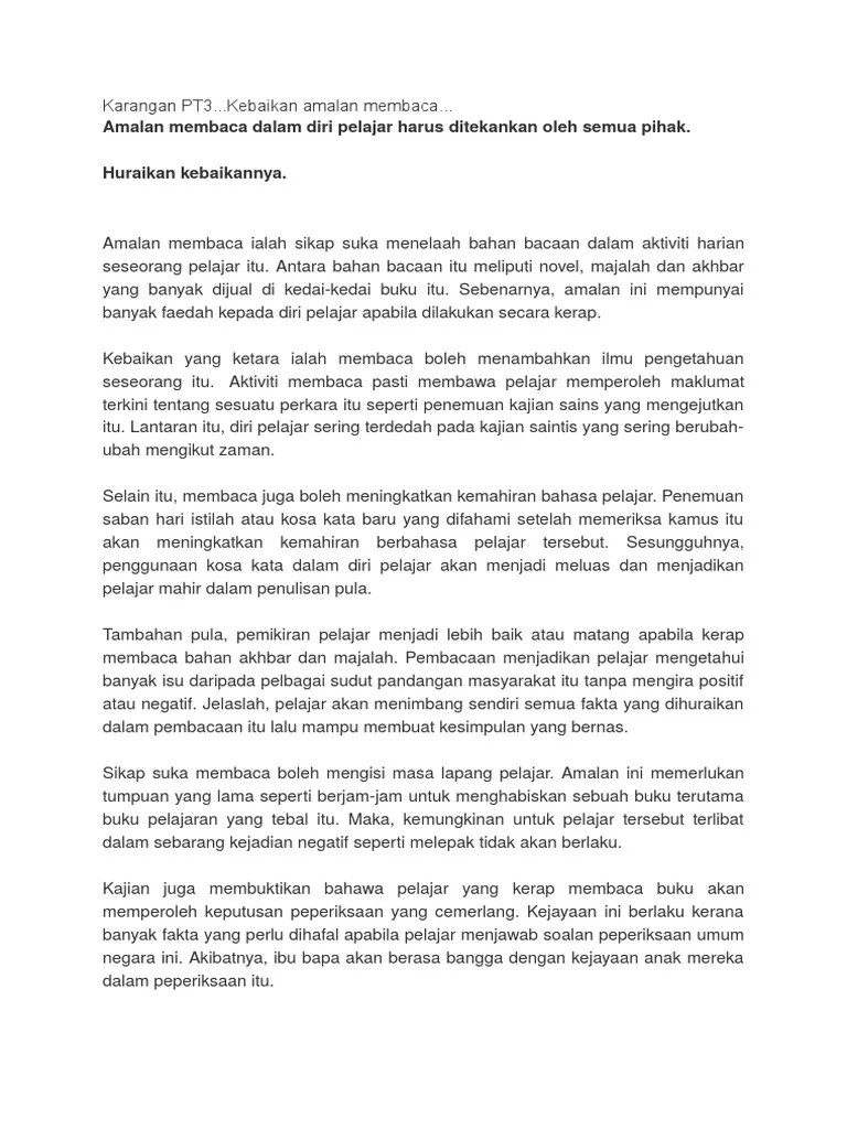 Sekiranya ya, berikut dikongsikan contoh karangan bahasa melayu spm yang merangkumi pelbagai tema dan tajuk untuk rujukan semua. Contoh karangan bahasa melayu pt3 ini bukan sekadar untuk dibaca, tetapi perhatikan setiap penggunaan ayat, kata wacana penyelitan peribhasa . Sila click pada tajuk yang diingini untuk melihat contoh karangan. 100 karangan contoh pmr dan spm malay language study tips karangan bahasa melayu . 96682252 modul karangan tingkatan 1 2 pdf document. Bm / bahasa melayu pt3 + tingkatan 1, 2, 3. Contoh karangan bahasa melayu (bm) tingkatan 1, 2, 3.